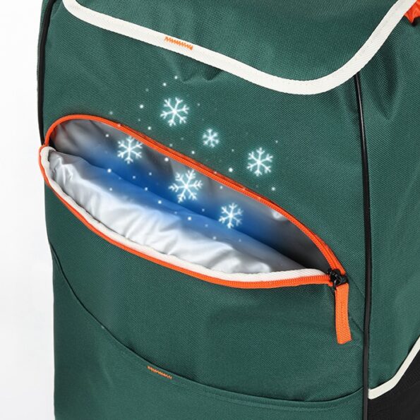 Open de diepgroene tas en ontdek een levendig oranje interieur. Dit stijlvolle contrast maakt het niet alleen makkelijk om uw spullen te vinden, maar voegt ook een moderne, energieke touch toe aan uw natuurlijke look.